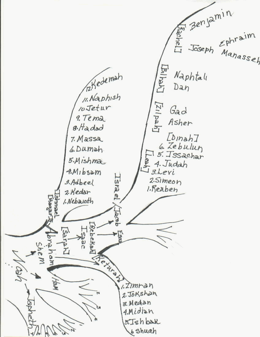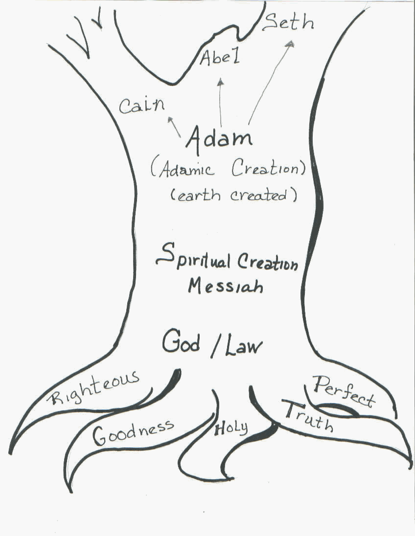 Preparation Tasks: Using the 8 ½ x 11 drawing of the Tree of God (i.e. trunk of the tree) as a pattern, enlarge the drawing on cardboard or butcher’s paper. Allow the children to paint or colour the tree. When the tree is dry mount it on the wall. Prior to the lesson use 3x5 cards and write one word per card. The list includes: righteousness, goodness, holy, perfect, truth, (God); Law of God, Messiah, spiritual creation, (creation of the Earth), (Adamic creation), Adam, Cain, Abel, Seth, Noah, Shem, Ham, Japheth, Abraham, Ishmael by Hagar, (and the 12 princes of Ishmael if you want the children to be familiar with them); Isaac by Sarah; Esau by Rebekah, Jacob (Israel) by Rebekah; Leah, Zilpah, Bilhah, Rachel, Reuben, Simeon, Levi, Judah, Issachar, Zebulon, Dinah, Asher, Gad, Dan, Naphtali, Joseph, Ephraim, Manasseh, Benjamin, Keturah (and the 6 sons of Keturah if you want the children to be familiar with them).